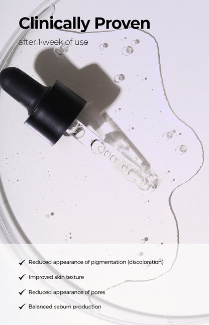 Unifica el tono de la piel, reduce la aparición de manchas oscuras y mejora la decoloración. Controla la producción de sebo.
